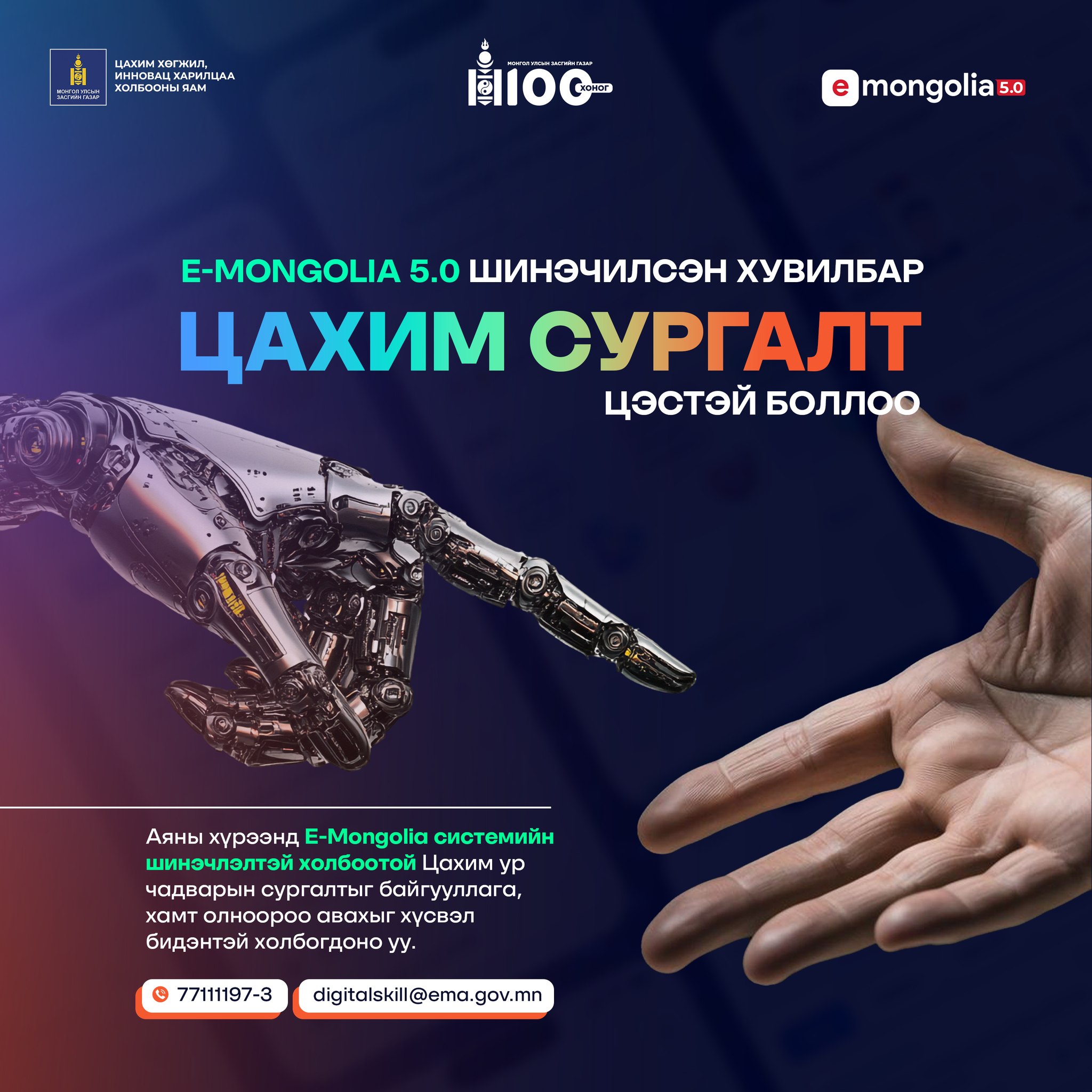 Мөн тоон тэгш бус байдлыг бууруулах, бүх нийтийн цахим ур чадварыг жигд түвшинд хүргэх зорилгоор E-Mongolia платформ “ЦАХИМ СУРГАЛТ” цэстэй болсон бөгөөд цахим ур чадварын сургалтыг байгууллага, хамт олноороо авахыг хүсвэл бидэнтэй холбогдоно уу. Мөн surgalt.gov.mn-д тус сургалтууд байршсан байна.