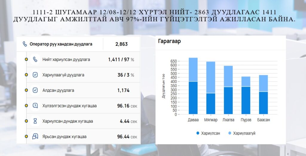 “И-Монгол академи” УТҮГ-ын Сургалт, олон нийттэй харилцах газрын 1111-2 шугамаар 12/08-12/12 хүртэл нийт 2863 дуудлагаас 1411 дуудлагыг амжилттай авч 97%-ийн гүйцэтгэлтэй ажилласан байна. Нийт 2043 иргэнд Social media-гаар иргэдийн асуудлыг шийдвэрлэж заавар зөвлөгөө өгч ажилласан.