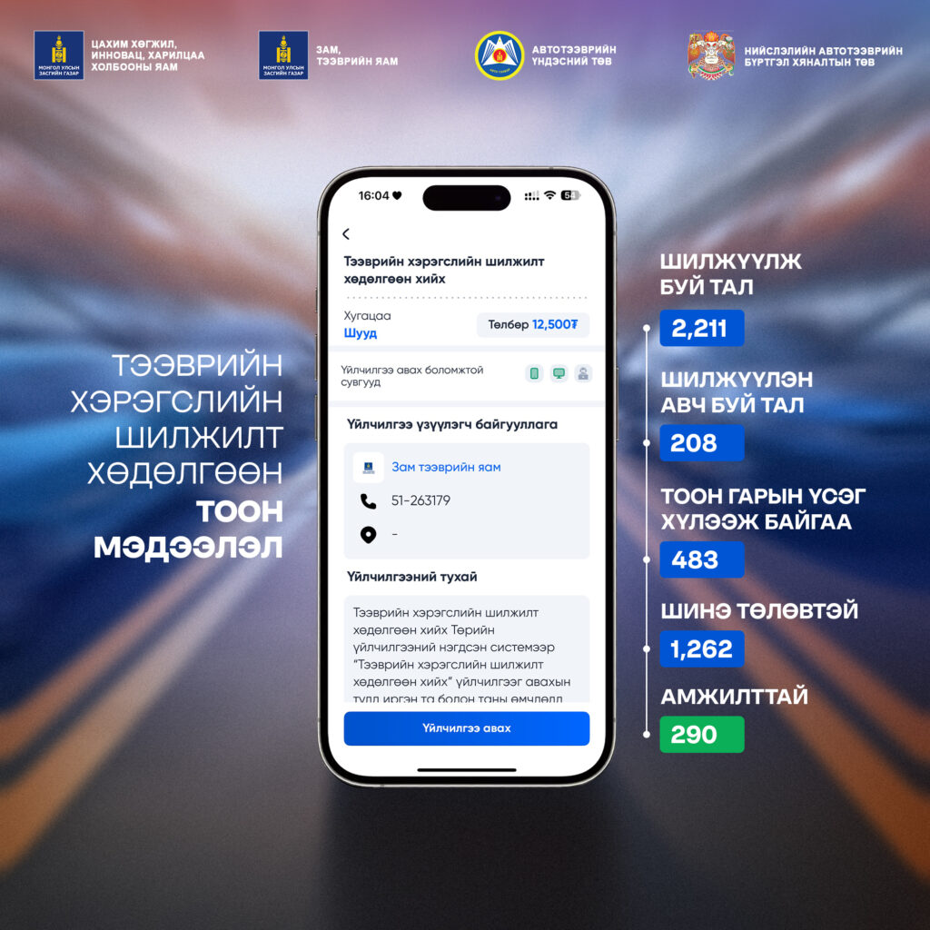 Өмнө нь тээврийн хэрэгслийн шилжилт хөдөлгөөн болон эзэмшигчийн нэр өөрчлөх үйлчилгээг авахын тулд иргэд худалдах, худалдан авах гэрээг нотариатаар батлуулж, Автотээврийн үндэсний төвийн салбар дээр биечлэн хандах шаардлагатай байсан бол тус үйлчилгээ цахимжсанаар 14 хоногийн хугацаанд нийт 2419 иргэн цахимаар үйлчилгээгээ авсан байна.